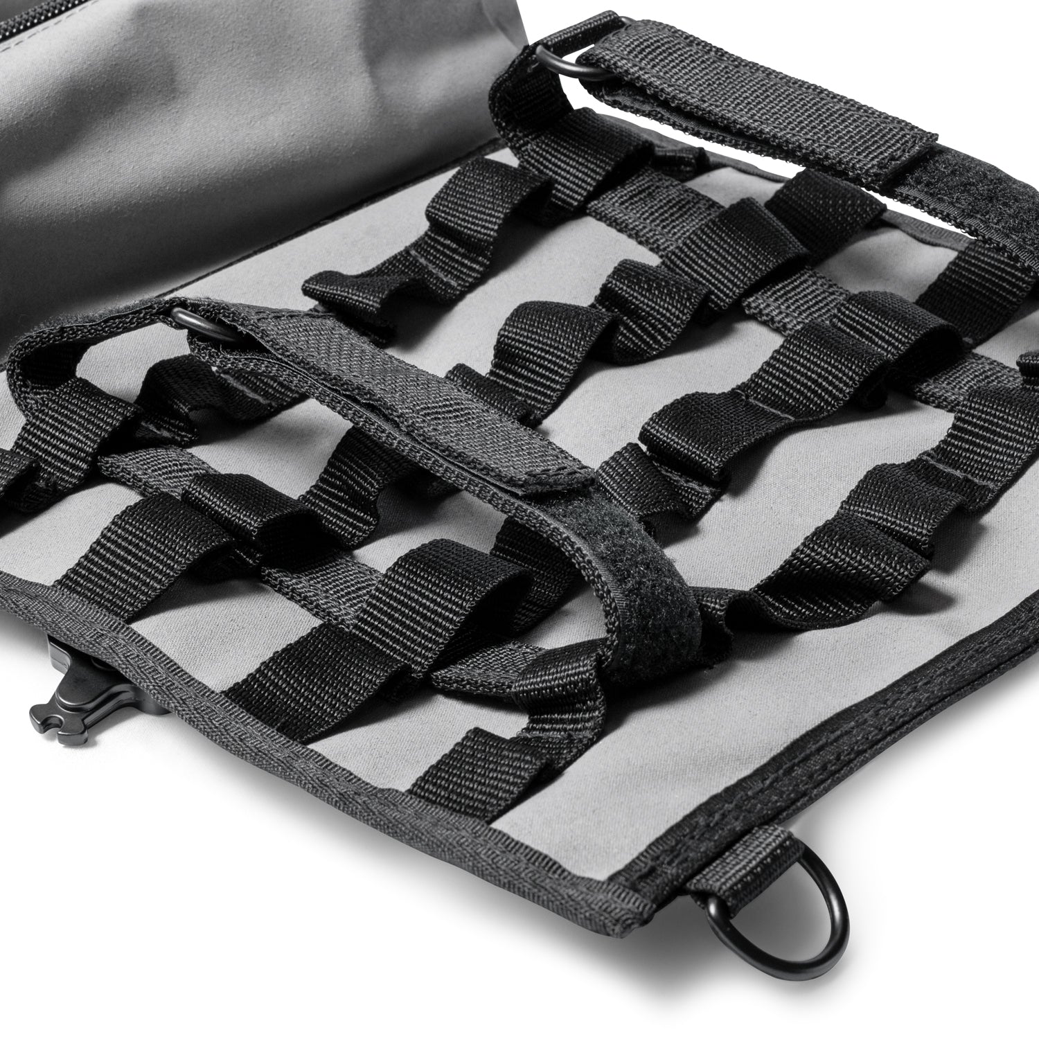 The Heavy Duty Bushranger Kinetic Recovery Tool Roll provides simple off-road recovery when you need it most. This grab-and-go kit includes the larger 12K Kinetic Rope for effective snatch recovery, two soft shackles for safe connection, and gloves for hand protection. Extra compartments let you add your own tools and accessories. Thoughtfully designed & made in Australia, the tool roll features MOLLE panels for flexible gear attachment, a mesh pocket for visibility, and two permanent canvas pockets for easy sorting, all helping you stay organised and ready. Its durable canvas build with wide straps and heavy-duty buckles ensures quick access, so you can resolve recovery challenges and get back on track. Compact and rugged, it fits most 4WD spaces for reliable, hassle-free storage.