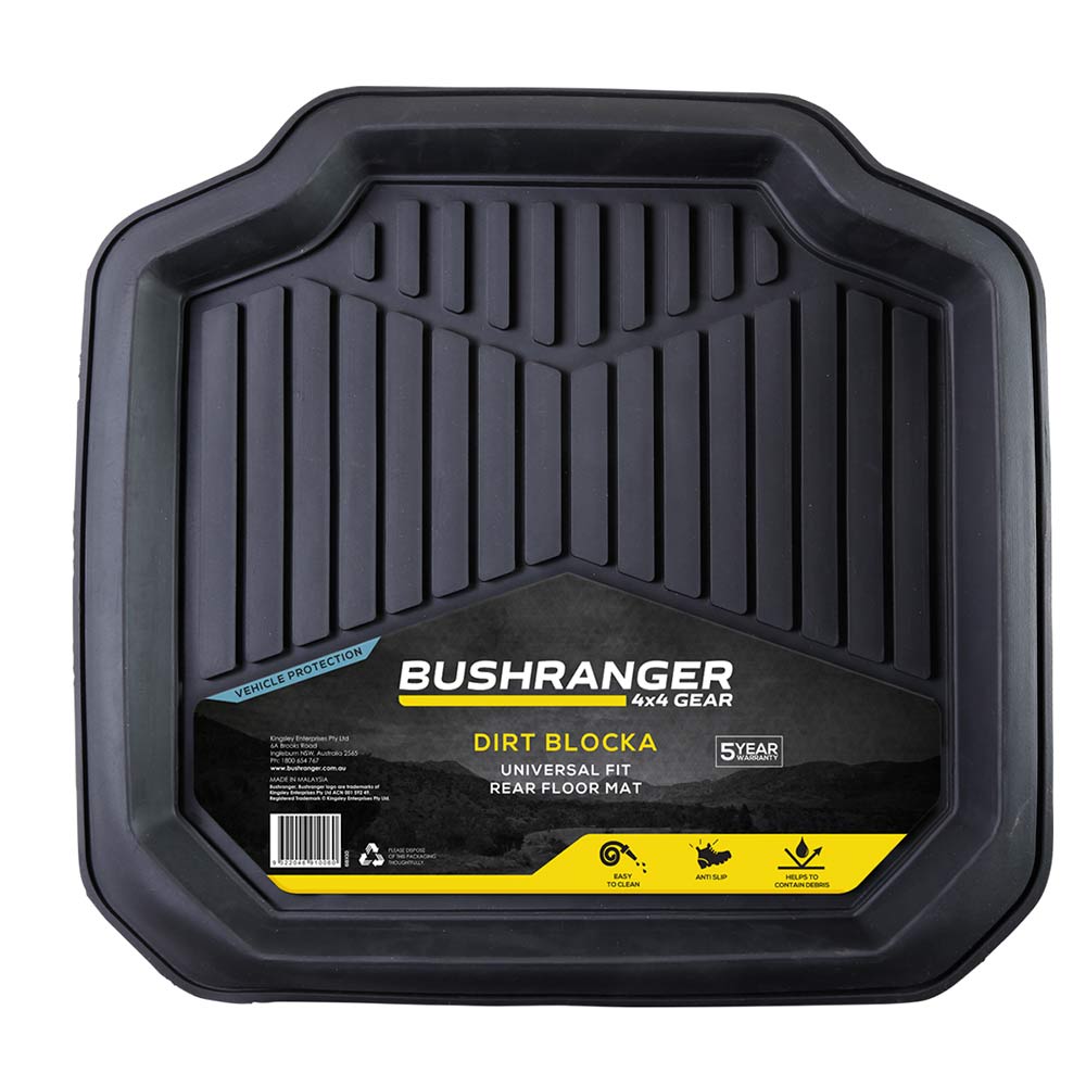 The Bushranger® Dirt Blocka Mats designed with deep edges to capture all the debris that is brought into the vehicle, from sand, dirt, mud, snow, even water can be contained within the mats. Made from a solid rubber construction that retains integrity and shape and easy to clean. A 5cm high perimeter ridge to keep debris enclosed from your interior material. Underside of mat features ribs to prevent mat slippage. Generous size to suit even the largest 4x4, they can also be trimmed to suit your foot well.